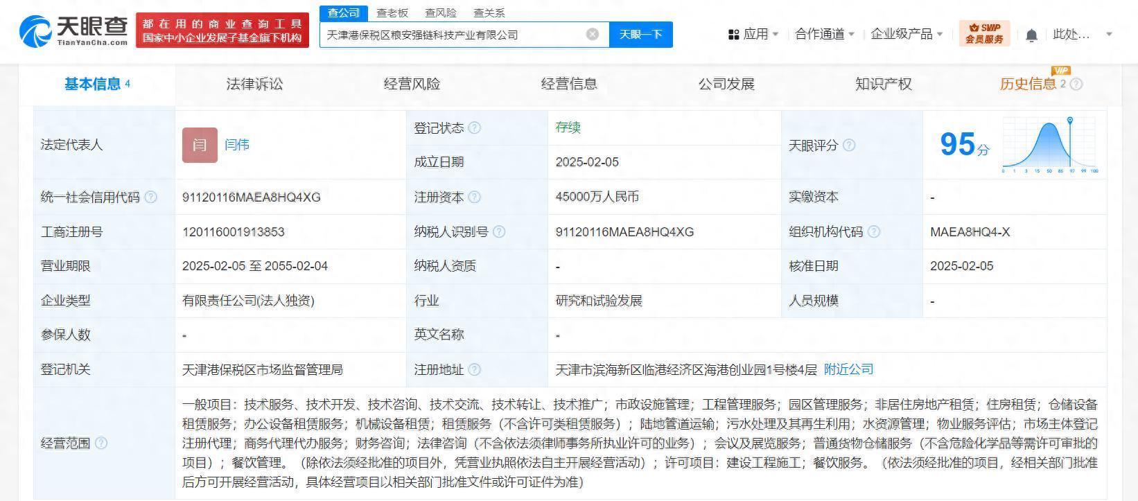 天眼查App显示,近日,天津港保税区粮安强链科技产业有限公司成立,法定代表人为闫伟,注册资本4.5亿人民币,经营范围含市政设施管理、工程管理服务、非居住房地产租赁、住房租赁、租赁服务、水资源管理、商务代理代办服务、财务咨询、普通货物仓储服务等。股东信息显示,该公司由天津临港新动能经济开发有限公司全资持股。